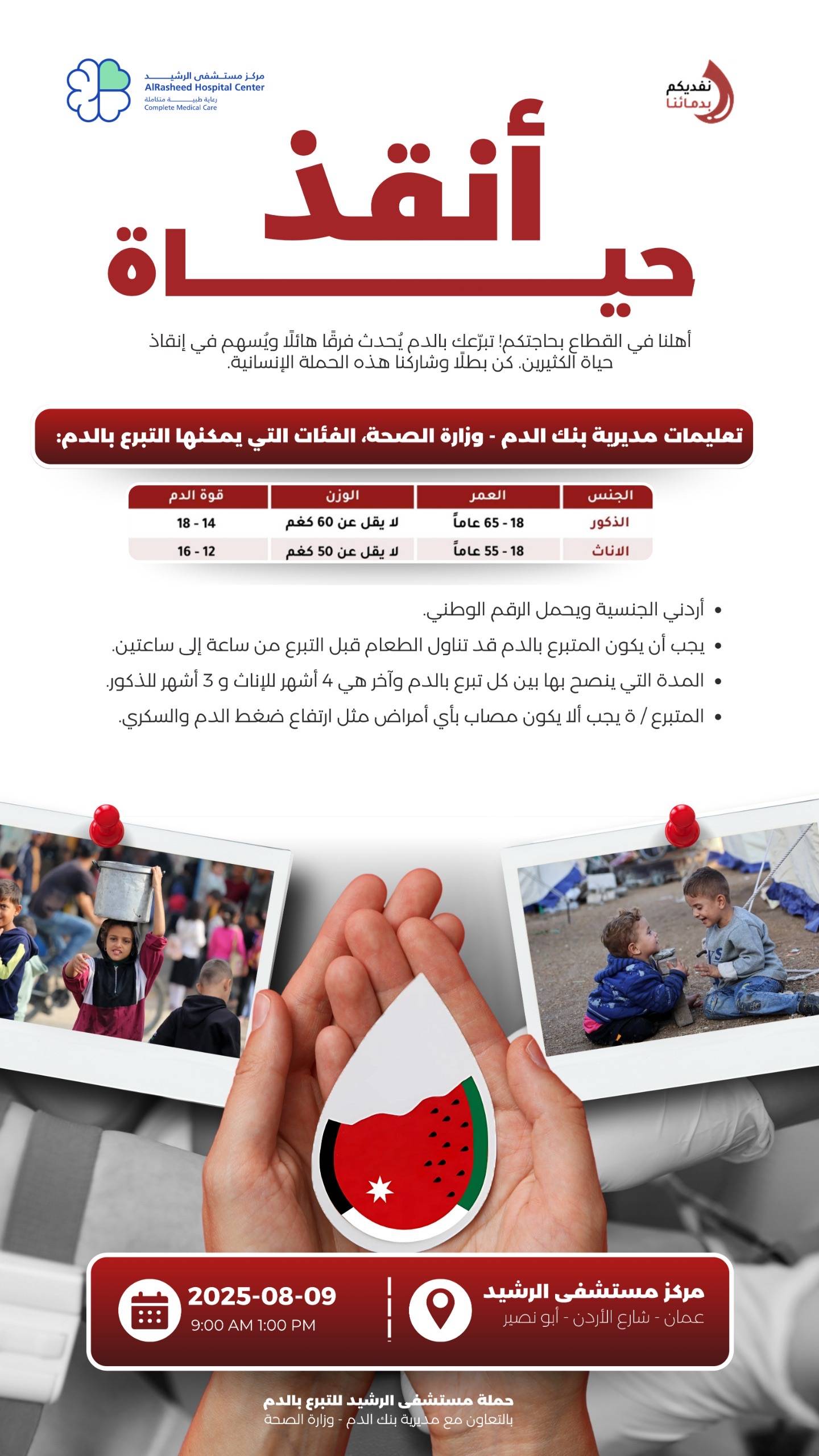 مستشفى الرشيد يطلق حملة للتبرع بالدم لأهلنا في قطاع غزة