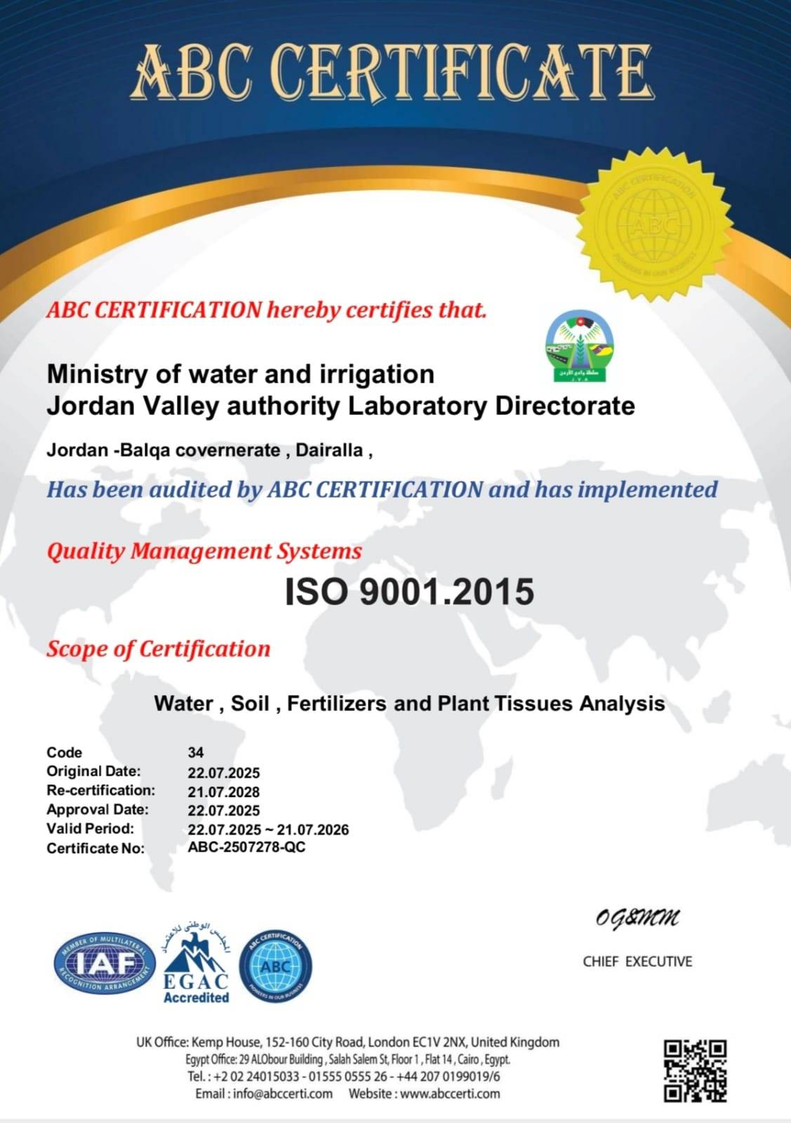 سلطة وادي الأردن تحصل على الاعتماد دولي لمختبراتها (شهادة ISO 9001:2015)