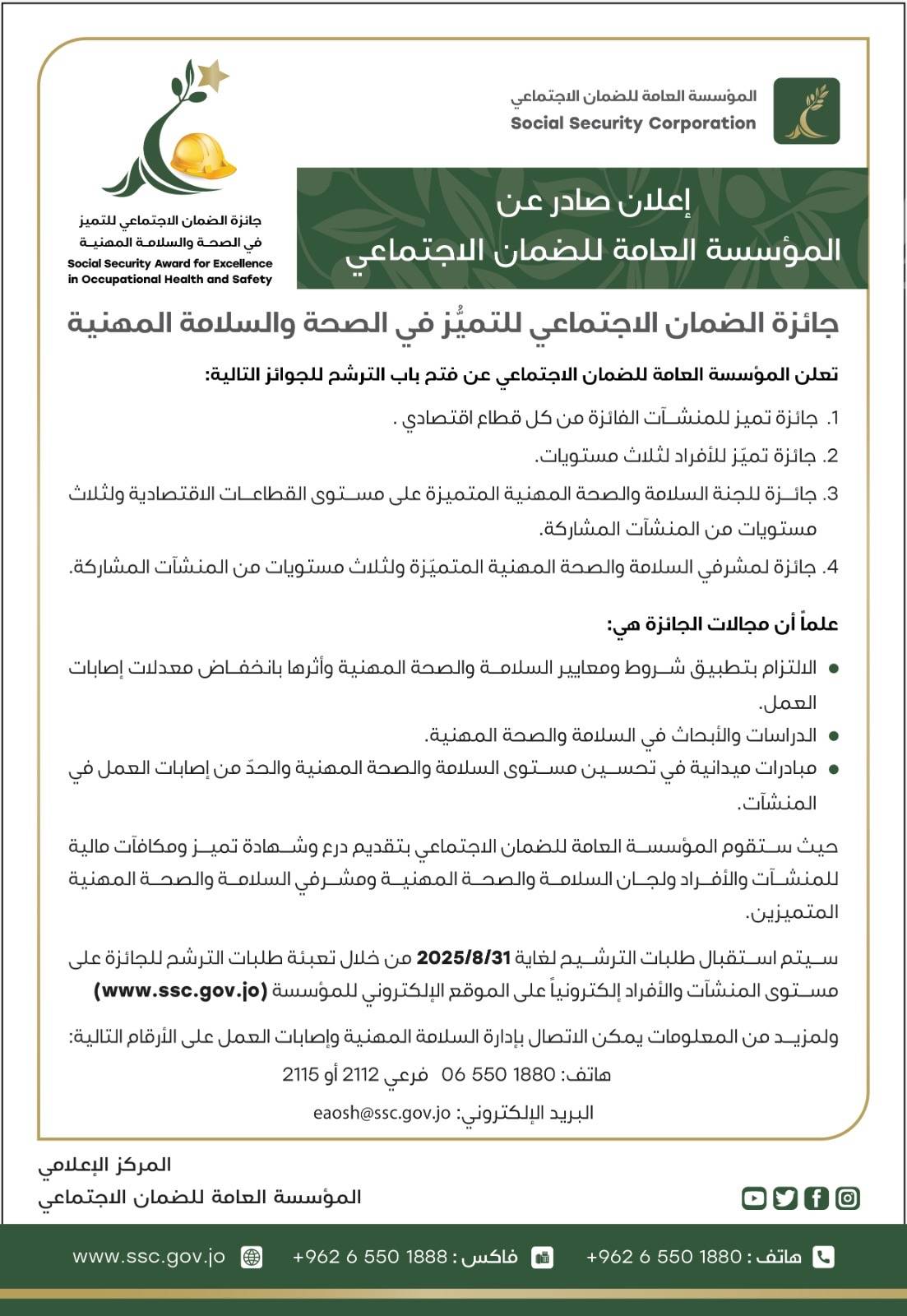 الضمان: تمديد استقبال طلبات الترشّح لجائزة الضمان الاجتماعي للتميّز في الصّحة والسّلامة المهنيّة حتى نهاية شهر آب المقبل
