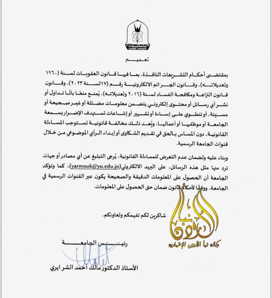 جامعة اليرموك تصدر تعميمًا تحذيريًا يمنع تداول الشائعات والمعلومات المضللة( وثيقة)