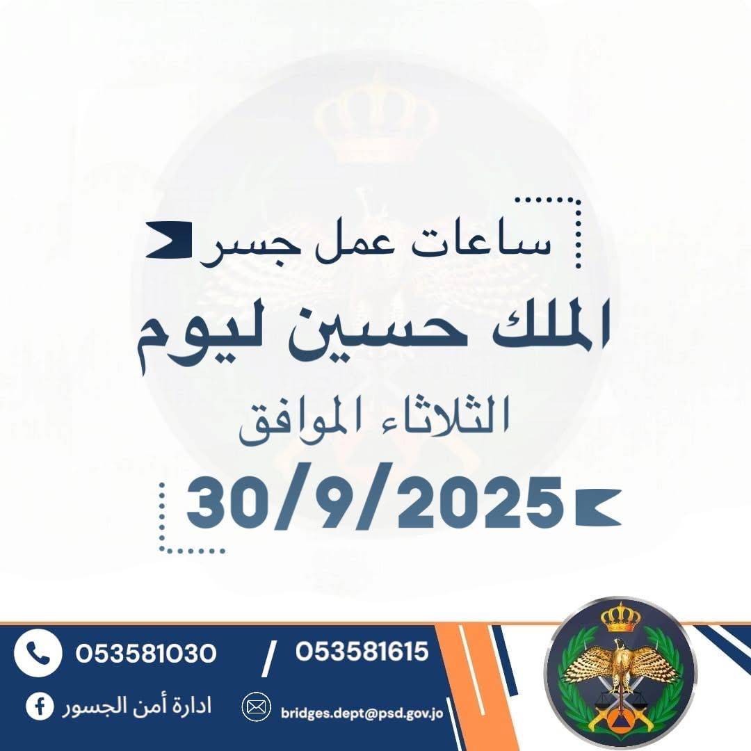 تعديل ساعات عمل جسر الملك حسين يوم الثلاثاء 30 أيلول