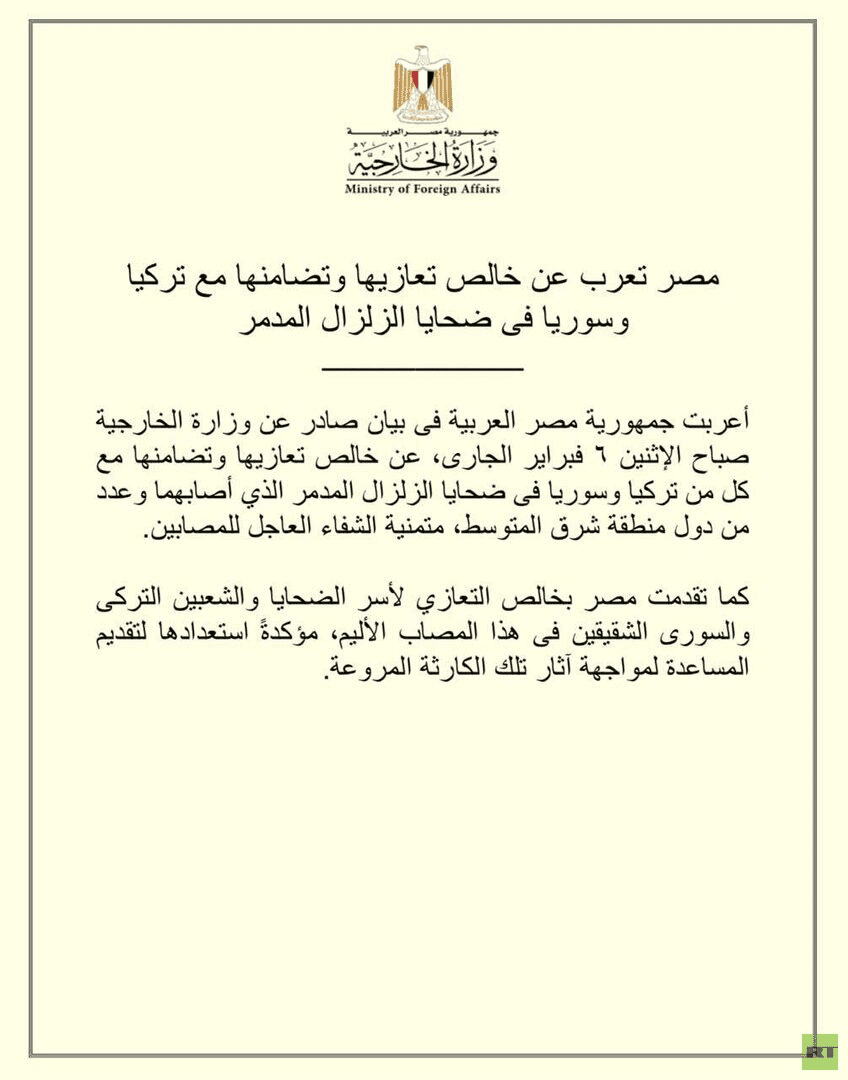 مصر تقدم تعازيها وتعلن تضامنها مع سوريا وتركيا2023-02-06 11:47:31 -