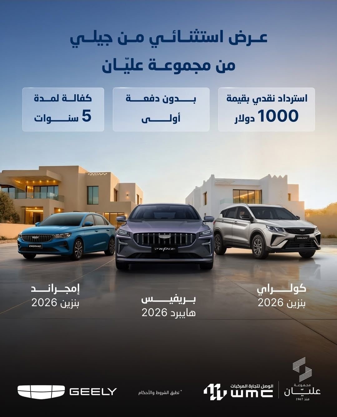 عرض استثنائي من جيلي – مجموعة عليان: استرداد نقدي بقيمة 1000 دولار وبدون دفعة أولى