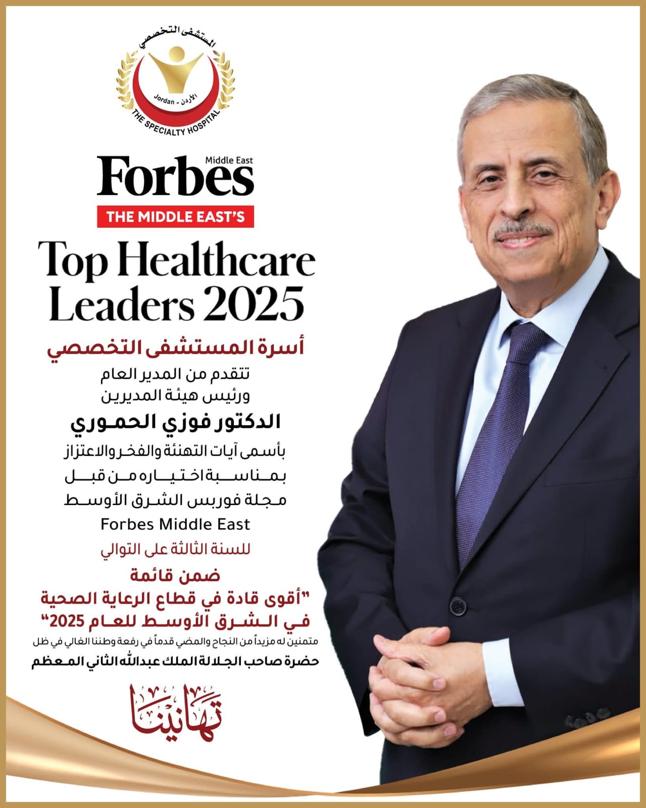 الحموري ضمن أقوى قادة الرعاية الصحية في الشرق الأوسط لعام 2025 حسب تصنيف فوربس الشرق الأوسط