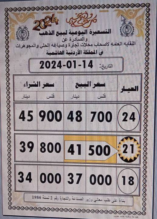 41.5 دينار سعر الذهب عيار 21 بالسوق المحلية2024-01-13 -