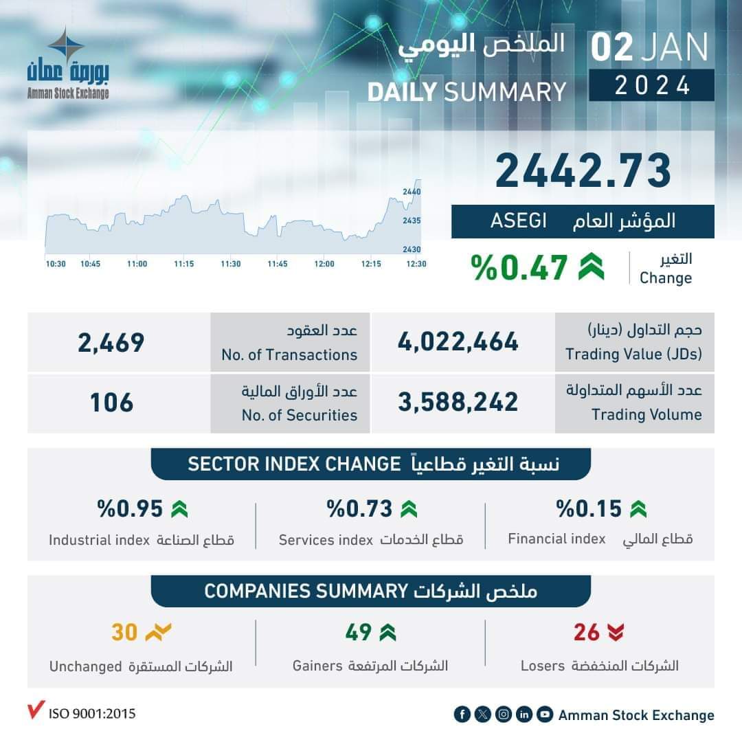 تفاصيل الملخص اليومي لبورصة عمان2024-01-02