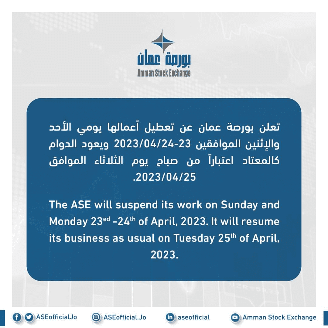 بورصة عمان : الأحد والاثنين عطلة2023-04-19 20:03:34 -