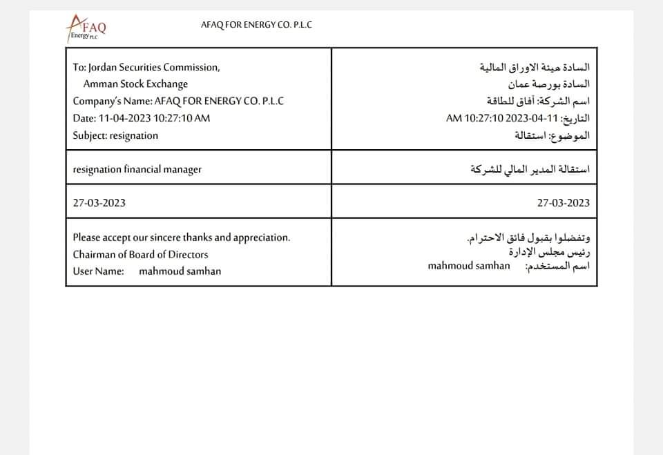 استقالة المدير المالي لشركة آفاق للطاقة2023-04-11 12:52:28 -