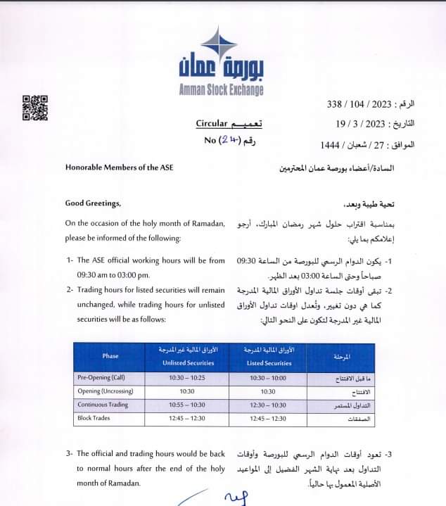 بورصة عمان تعلن عن أوقات التداول والدوام خلال شهر رمضان2023-03-19 12:34:09 -