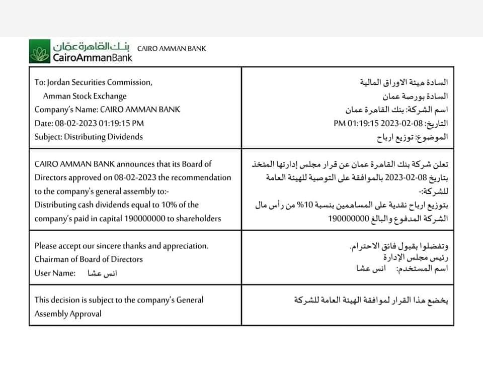 بنك القاهرة عمان يعلن عن توزيع 10%من أرباحه على المساهمين2023-02-08 16:54:55 -