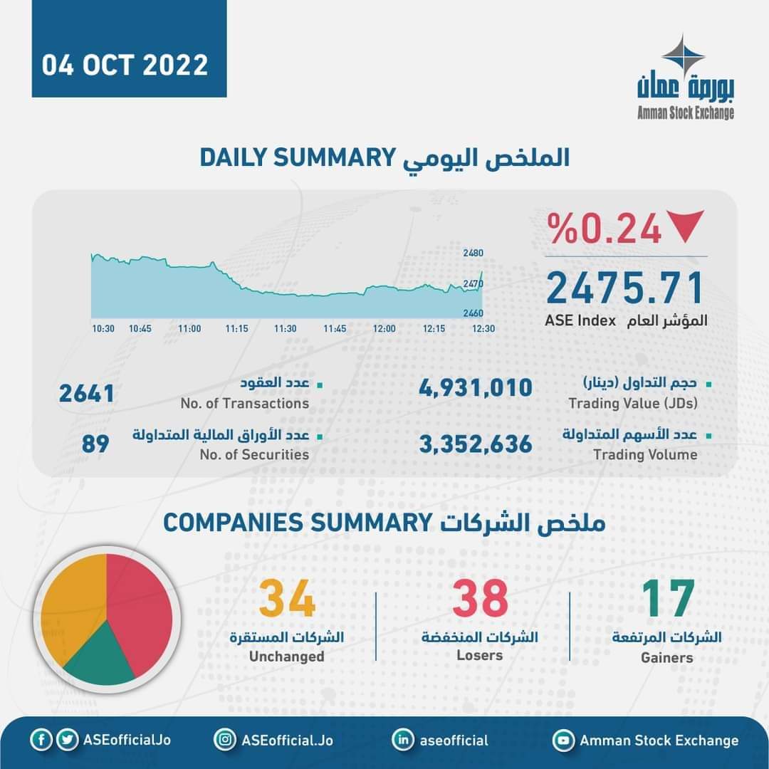 الملخص اليومي لبورصة عمان2022-10-03 13:59:13 -
