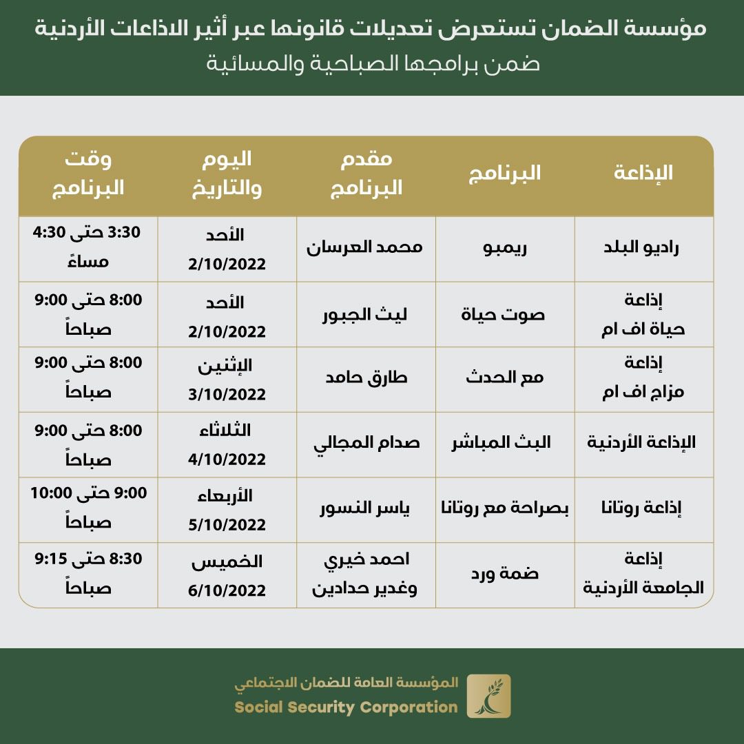 الضمان تستعرض تعديلات قانونها عبر الإذاعات الأردنية2022-10-01 15:11:26 -