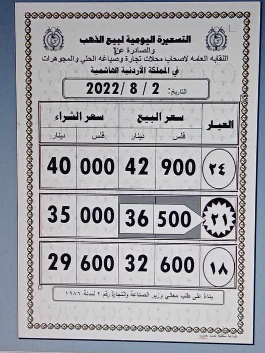 أسعار الذهب في الأردن2022-08-01 09:52:48 -