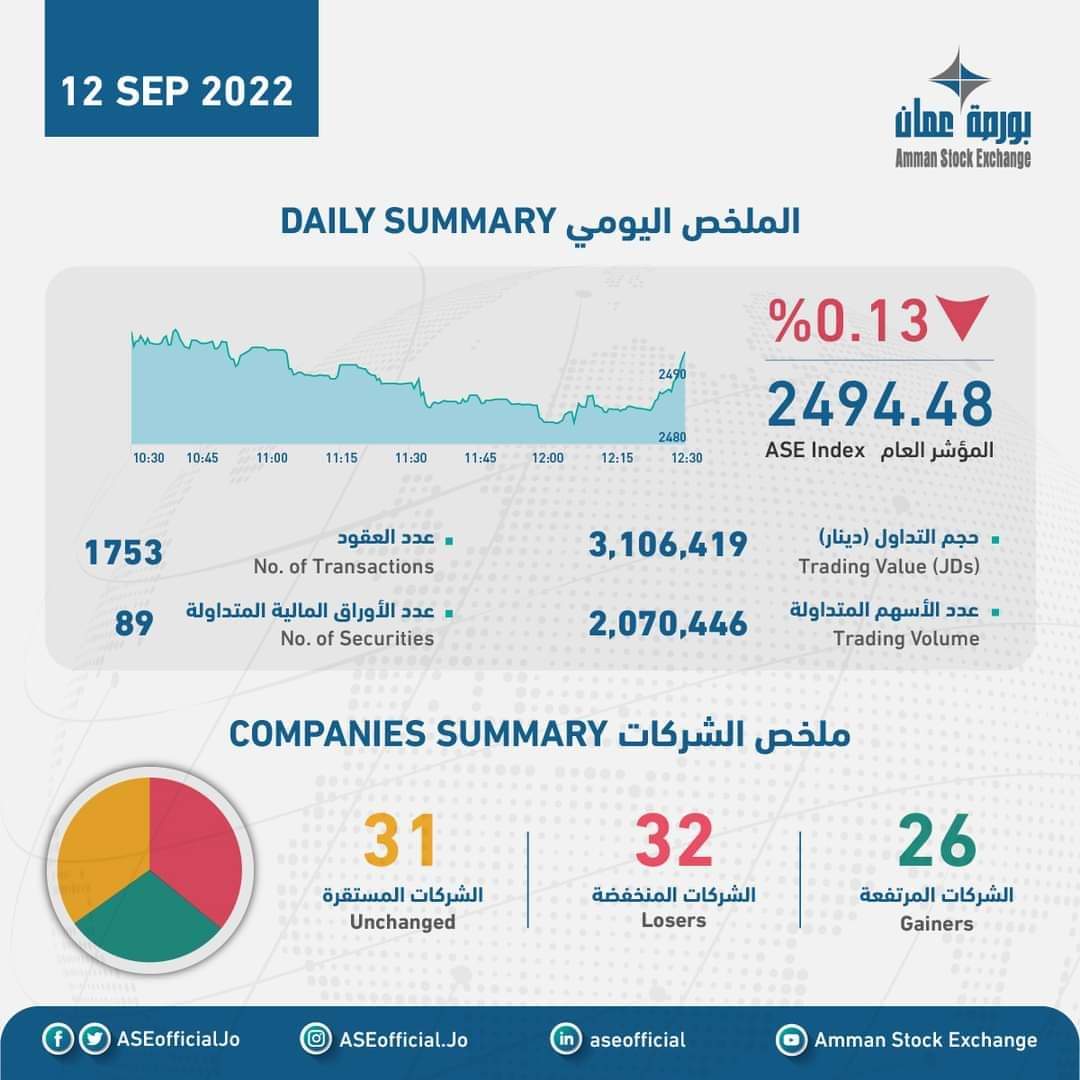 تفاصيل الملخص اليومي لبورصة عمان2022-09-11 16:03:35