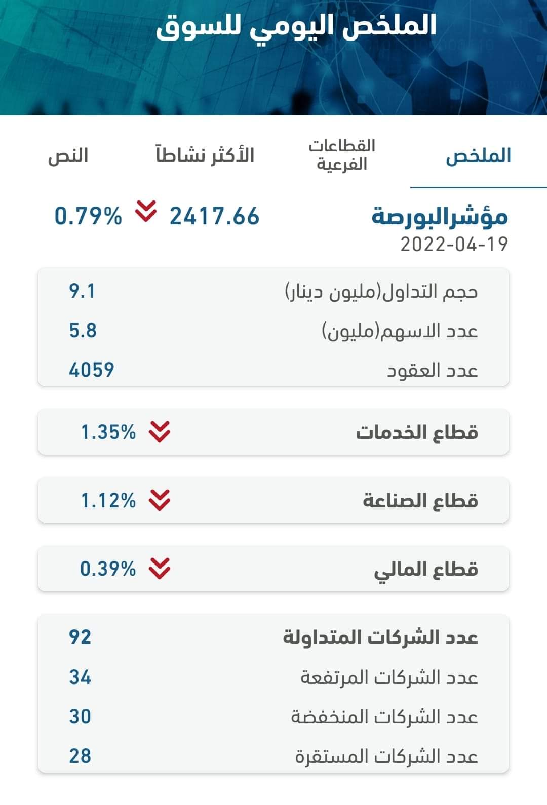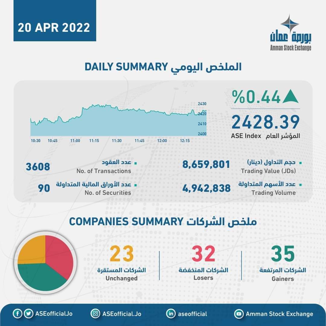 الملخص اليومي لبورصة عمان2022-04-20 21:01:26 -