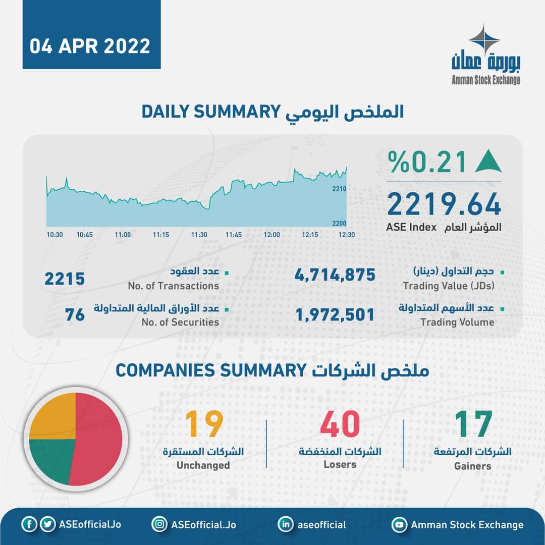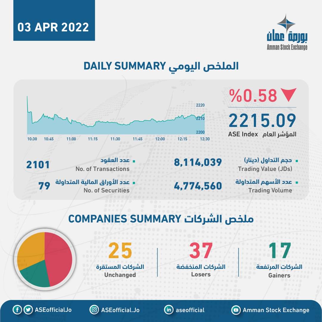 تفاصيل ملخص سوق عمان المالي في أول يوم برمضان2022-04-03 15:56:53 -