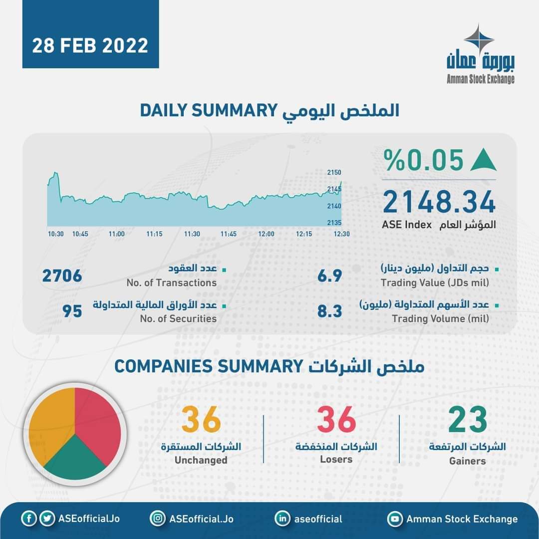بورصة عمان : حجم التداول 6.9 مليون دينار2022-02-28 16:42:18 -