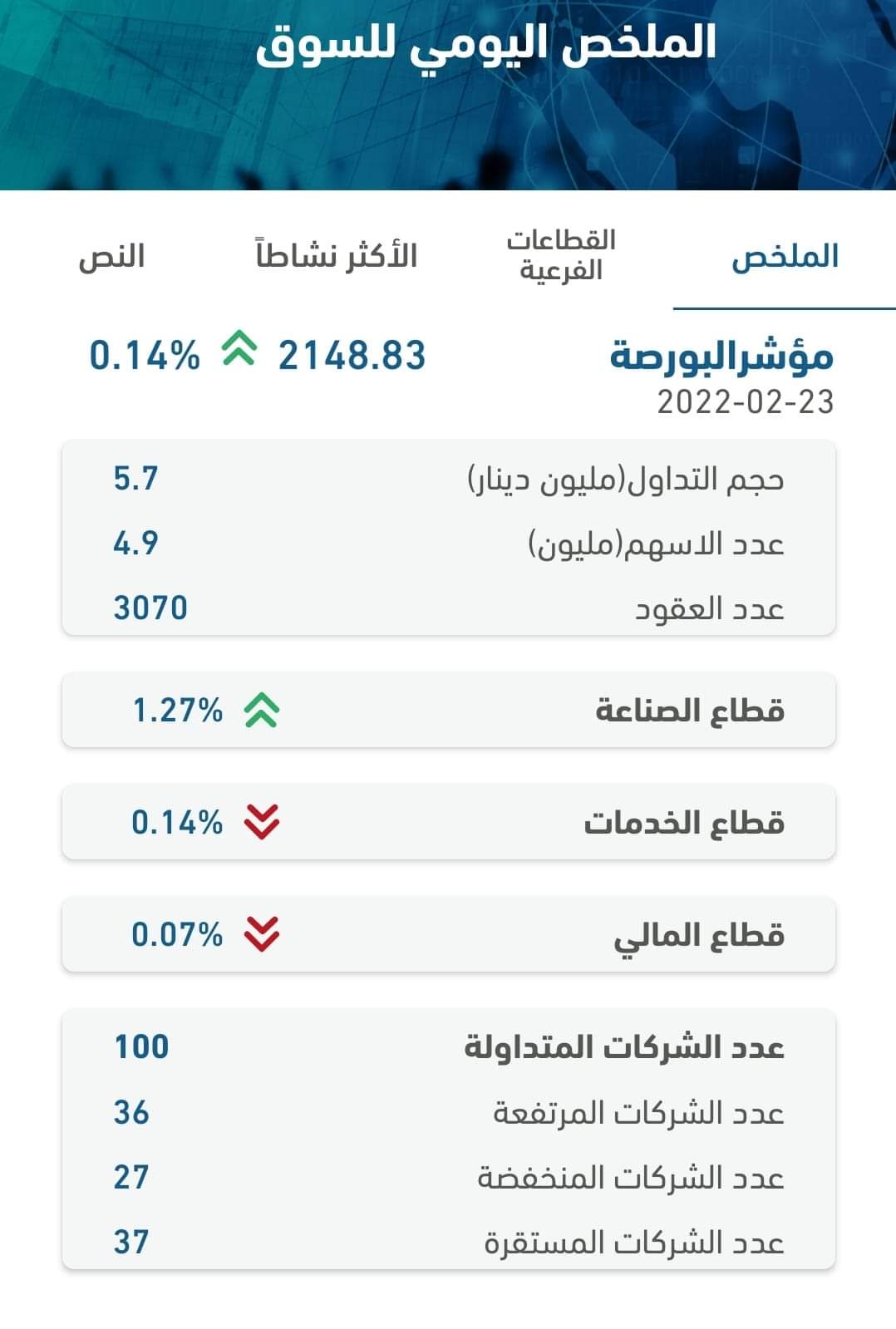 الملخص اليومي لبورصة عمان2022-02-22 23:28:46 -