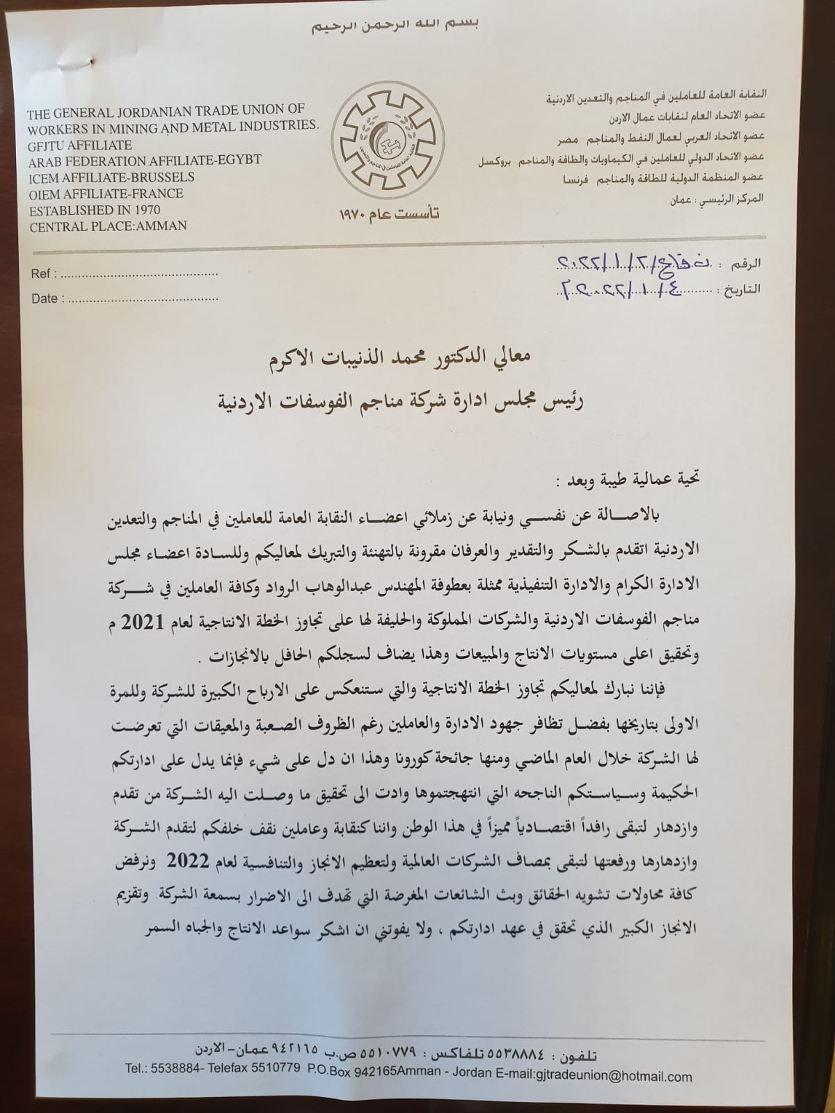أبو هديب يوجه رسالة شكر وتقدير للرئيس التنفيذي وجميع العاملين في البوتاس2022-01-03 11:59:37 -
