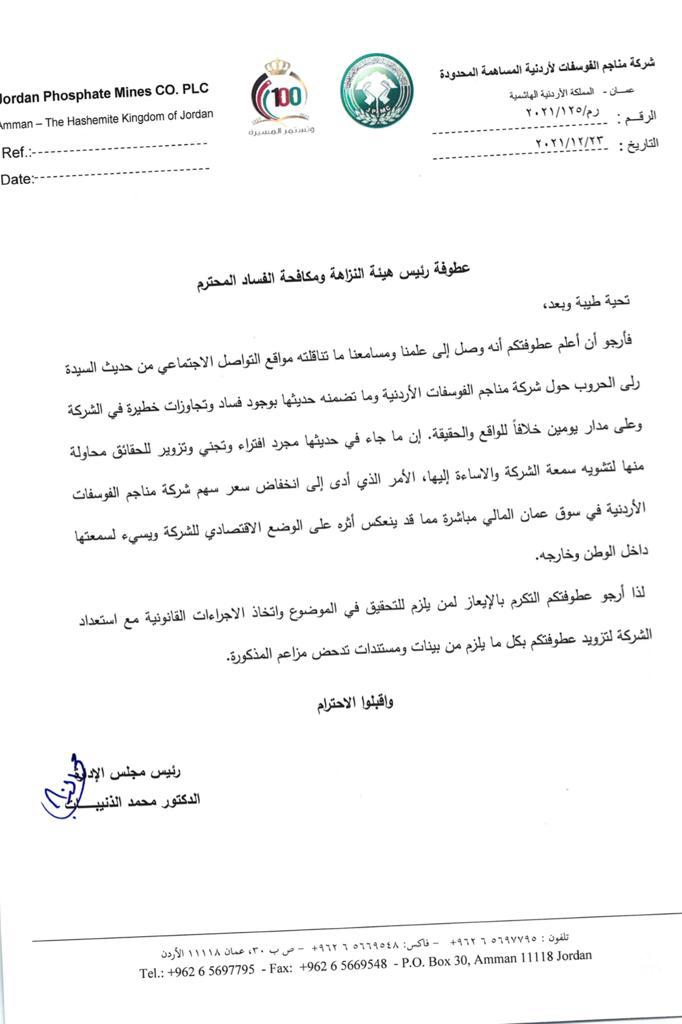 سهم الفوسفات ينخفض .. وذنيبات يُبرق لمكافحة الفساد2021-12-24 02:25:34