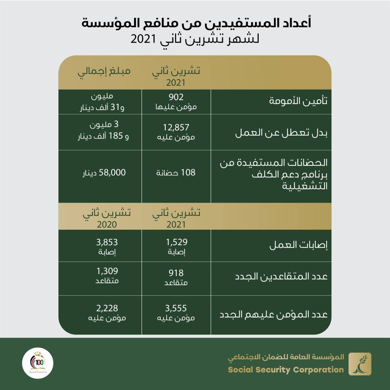 الضمان يكشف عن أعداد المُستفيدين من منافعه التأمينية لشهر تشرين ثاني20212021-12-21 18:17:39 -
