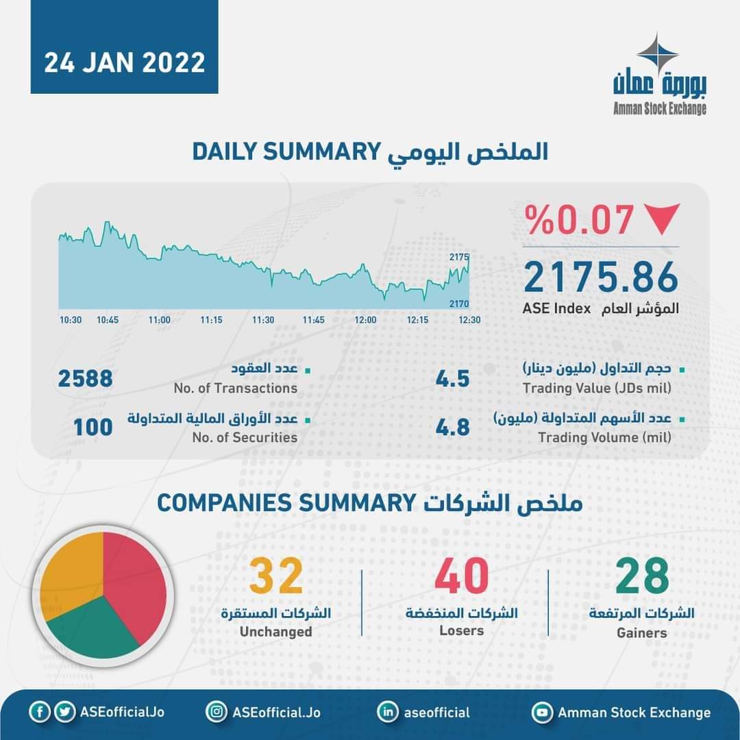 الملخص اليومي لتداول الأسهم في بورصة عمان2022-01-24 16:14:20 -