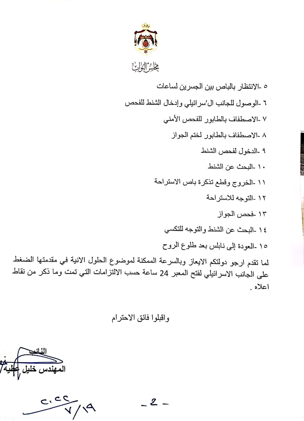 النائب خليل عطية يخاطب رئيس الوزراء لفتح جسر الملك حسين ل 24 ساعة2022-07-19 21:19:41 -