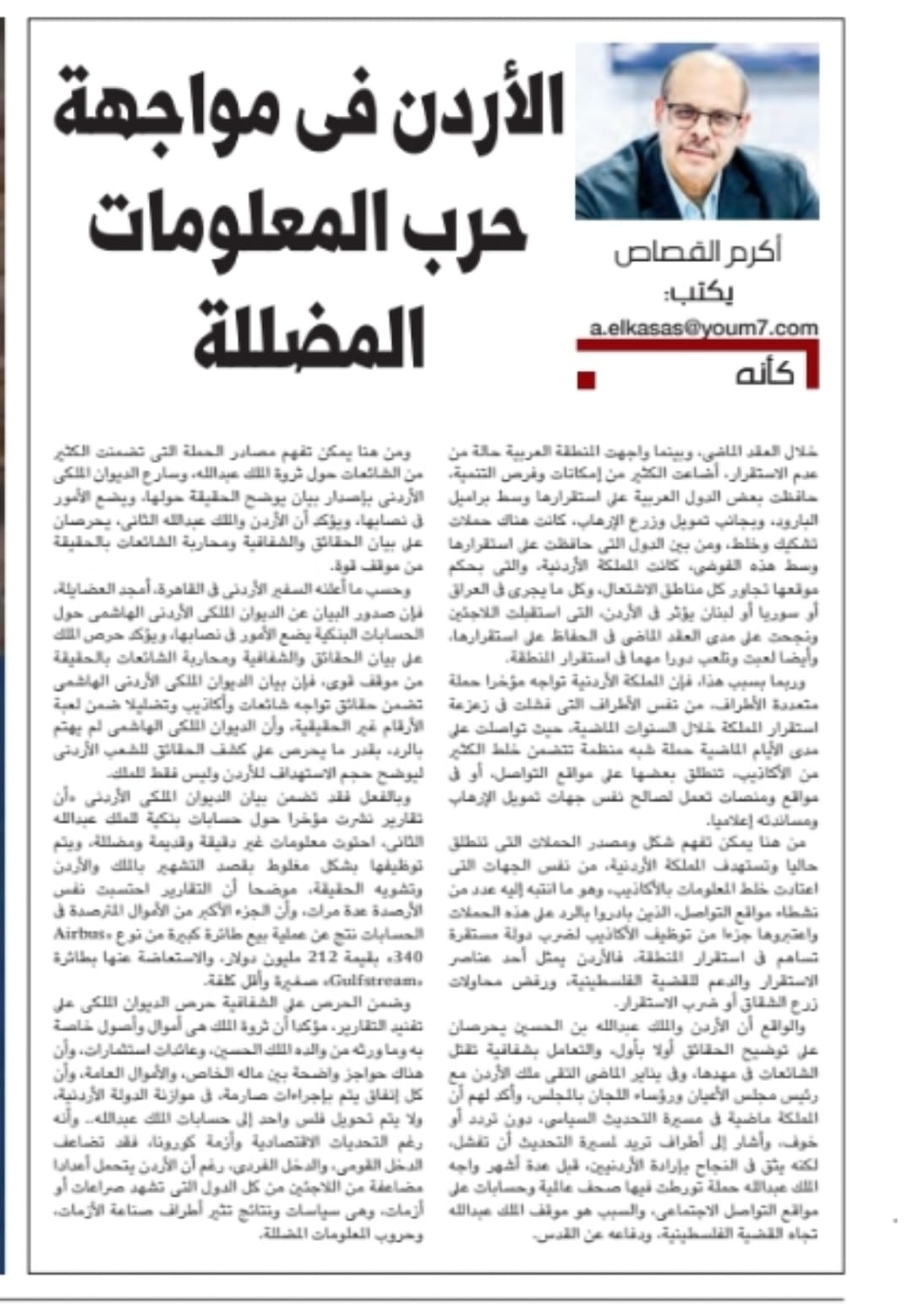 رئيس تحرير اليوم السابع المصرية يكتب : الأردن في مواجهة حرب المعلومات المضللة2022-02-24 13:38:06 -