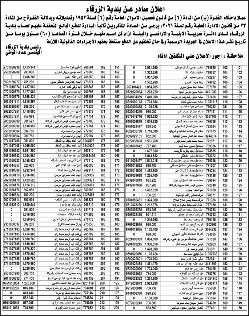 بلدية الزرقاء تنشر اسماء المتخلفين عن دفع الضرائب .. وتتوعد2023-03-04 14:21:59 -