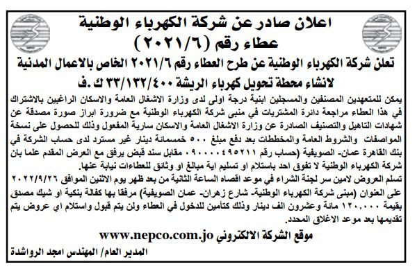 طرح العطاء الخاص بالأعمال المدنية لإنشاء محطة تحويل كهرباء الريشة2022-09-05 10:08:42 -