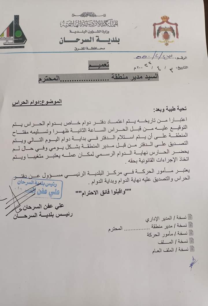 رئيس بلدية السرحان جولات تفتيشية على الحراس وتخصيص دفتر دوام لهم2022-04-03 20:32:12 -