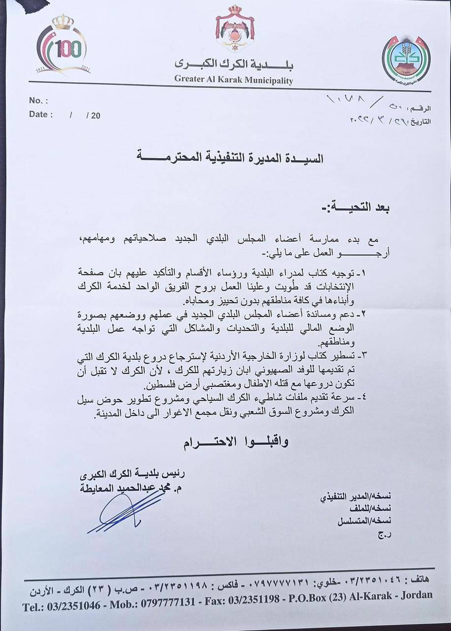 بلدية الكرك تخاطب الخارجية لاسترجاع دروع البلدية التي قدمت للوفد الصهيوني2022-03-26 10:45:49 -