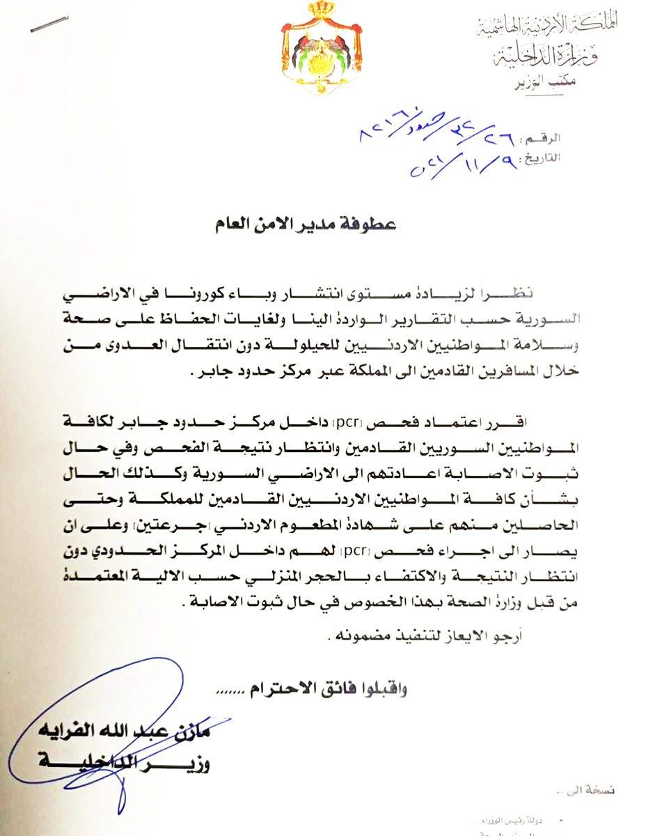 تعميم بإجراء فحص كورونا في جابر لجميع القادمين من سوريا - وثيقة2021-11-10 12:08:35 -