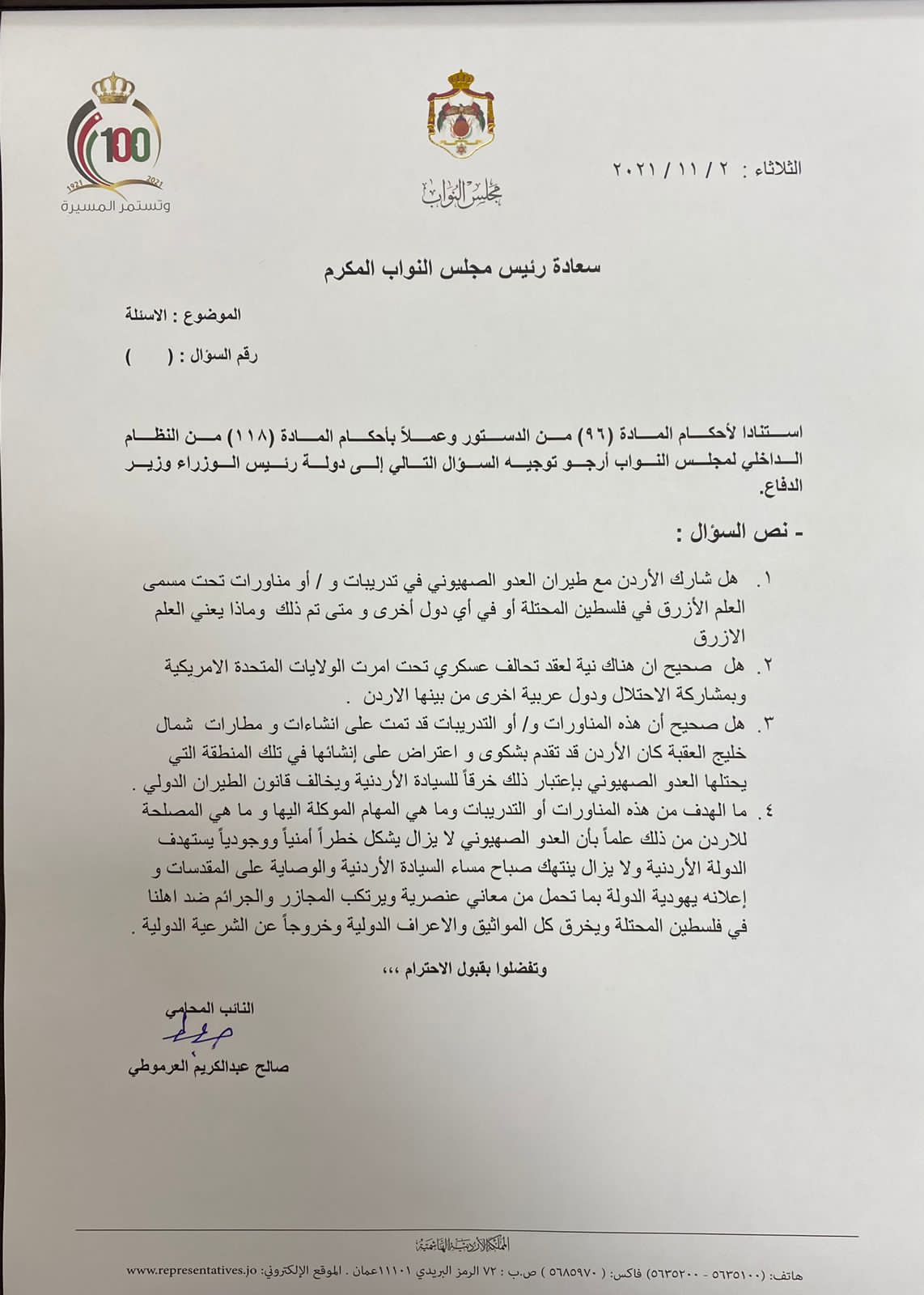 العرموطي يسأل الحكومة عن حقيقة مشاركة الأردن في مناورات "العلم الأزرق" - وثيقة2021-11-02 15:36:39 -