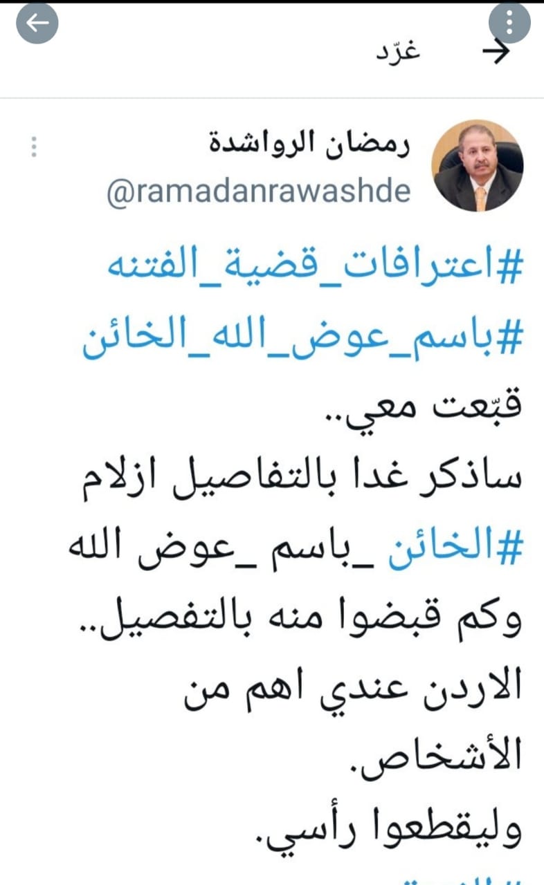 رمضان الرواشدة يوضح حول تغريدة "قبيضة عوض الله" : تخويفة2021-06-19 12:44:12 -