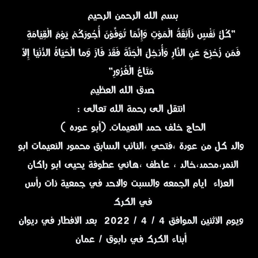 والد النائب السابق محمود النعيمات.. في ذمة الله2022-04-01 10:30:58 -